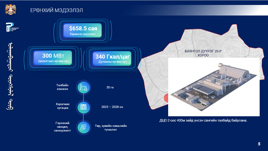 Баянгол дүүргийн 20-р хорооны нутаг дэвсгэр Дулааны II цахилгаан станцаас  400 метрийн зайд үндсэн сангийн талбайд баригдах уг Дулааны V цахилгаан станц нь 300 МВт цахилгаан эрчим хүч, 340Гкал/цаг дулааны эрчим хүч үйлдвэрлэх хүчин чадалтай юм. Түүнчлэн CFB зуух, агаарын хөргөлттэй, олон шатлалт агаар бохирдлын хяналттай байгальд ээлтэй технологийг ашиглах байна. Тус төслийг Монгол Улсын эрчим хүчний аюулгүй байдлыг хангах, эдийн засгийн үр ашигтай, байгаль орчинд ээлтэй, төр, хувийн хэвшлийн хамтын ажиллагааны жишиг төсөл болон хэрэгжих бүрэн үндэслэлтэй гэж үзэн Төр, хувийн хэвшлийн түншлэлийн тухай хуулийн 15.1.1-т заасан “Зураг төсөл, төсвийг боловсруулах, барих, ашиглах, шилжүүлэх” хэлбэрээр буюу олон улсын практикт түгээмэл хэрэглэгддэг DBFOM (Design, Build, Finance, Operate, Maintain) хэлбэрээр нэг түншлэлийн гэрээгээр хэрэгжүүлэх нь зүйтэй гэж үзэж байгаа юм.